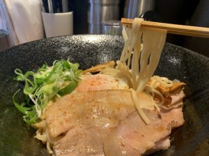 トッピングの揚げゴボウはパリッとした食感を残して簡単に噛めるので、箸休めでチビチビかじるのもいいですが、最初から細かく崩して麺と混ぜても面白いかもしれません。炙りチャーシューは薄くスライスされているので、肉好きにはちょっと物足りないかもしれません。でも、しっかりとタレのしみ込んだチャーシューは肉の旨味もしっかり味わえて、分厚いチャーシューよりも和風のコンセプトに合っていると思いました。