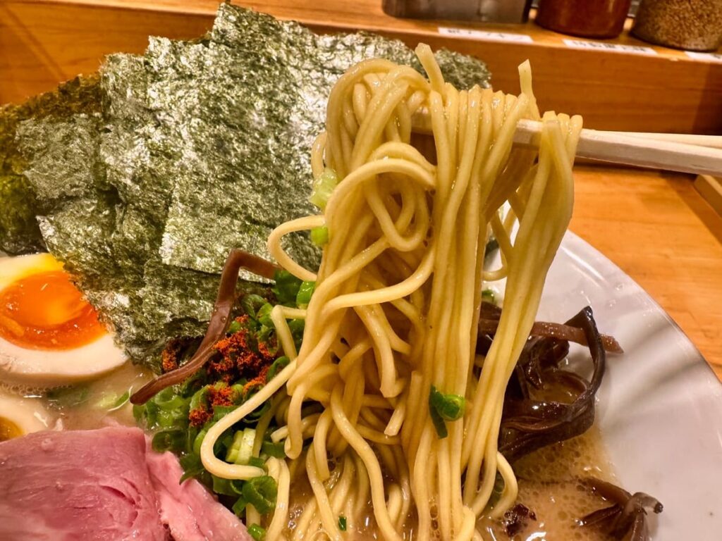 それでは早速、スープからいってみましょう…若干とろみがついていて濃厚な豚骨スープ。初代 麺家 あくた川のスープには鶏ガラも使われているのですが、こちらは豚骨100%のスープで造りが全く違います。そしてそこにほんのりと燻製の香りを乗せているのですが、その燻製臭がなかなかクセになりますね。あと、今回たまたまなのかもしれませんが、スープに脂がほとんど浮いてなかったので、スープを全部飲み干すのに心理的なハードルがかなり低めでした。