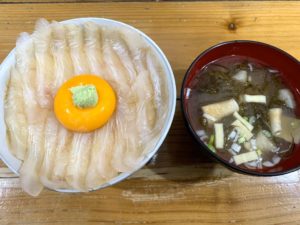 注文して5分ほどで運ばれた平目漬丼はこんな感じ。せんべい汁をつけなくても、単品の値段で味噌汁が普通についてきます。