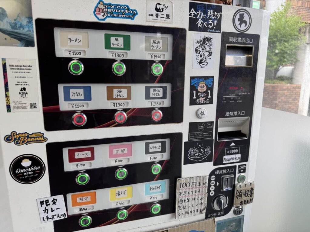 まずは入り口の右手にある券売機で食券を購入します。上の画像にあるように、基本的にはメニューはラーメン1択(注:令和7年6月現在、汁なしも注文できるようになりました。上の券売機の画像を参照)で、チャーシューや麺の増量、トッピングをカスタマイズしていくシステムです。券売機の左手にある洗濯バサミで麺の減量や汁なしの注文を行うのも、おしぼりや水がセルフサービスなのも他店と一緒です。