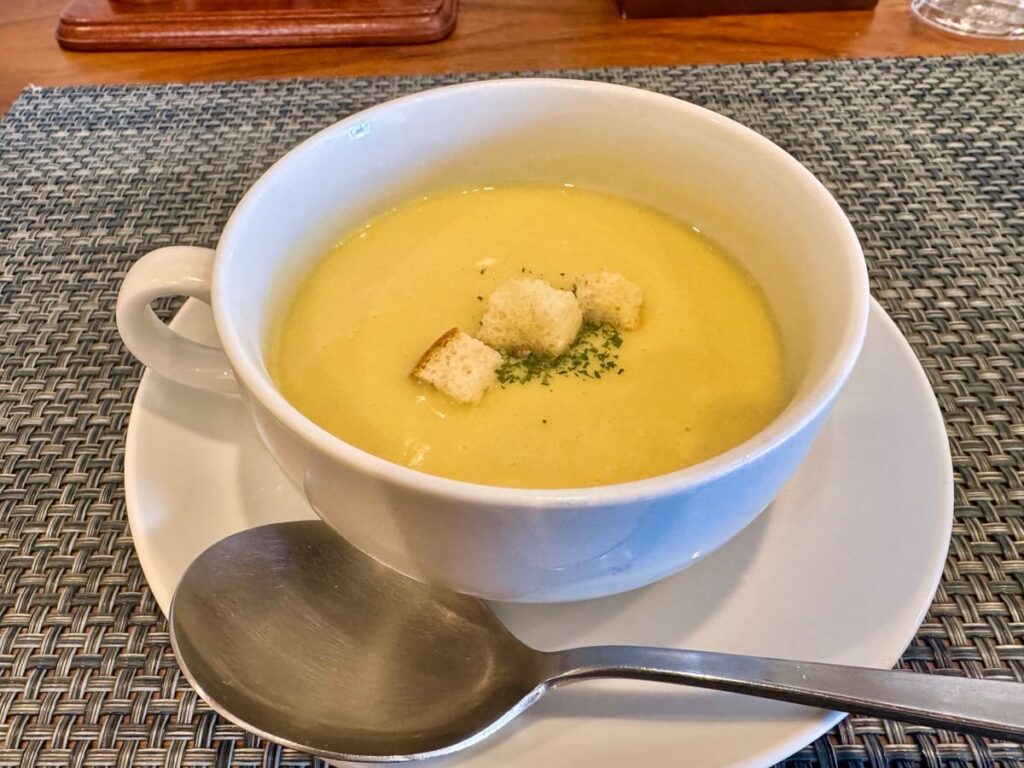 それでは、この日の僕が洋食屋ワタナベで注文したお昼の看板メニュー・Wランチ(お値段1600円+税)をご紹介しましょう。席に着いてから5分ほどで、まずはコーンスープが運ばれてきます…